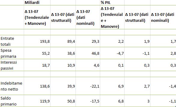 Nel complesso, tra il 2007 e il 2013 il saldo primario è invece peggiorato di 17,5 miliardi (-1,1% PIL) rispetto al dato 2007. In valore assoluto l’andamento della spesa primaria è stato sostanzialmente in linea con l’andamento programmatico, mentre le entrate sono risultate nettamente inferiori alle previsioni sia al netto del ciclo e delle una tantum (dato che mette in discussione l’efficacia delle manovre) che in termini nominali (a causa della dura recessione).