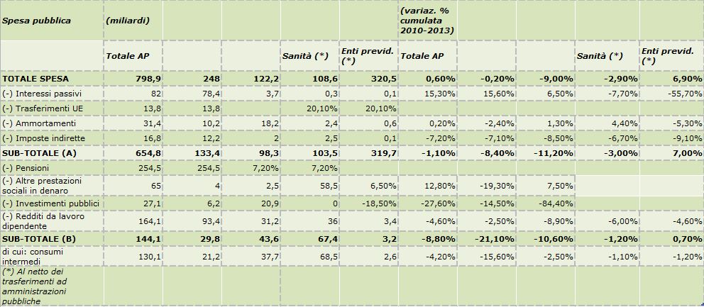 Nel 2013 la spesa pubblica complessiva è stata pari a 798,9 miliardi. Per quantificare la base di riferimento per la revisione della spesa può essere utile seguire una metodologia simile a quella utilizzata dall’allora commissario alla spending review Giarda nel suo Rapporto del maggio 2012. Dal totale vanno innanzitutto decurtate alcune voci di spesa estranee al processo di revisione della spesa: